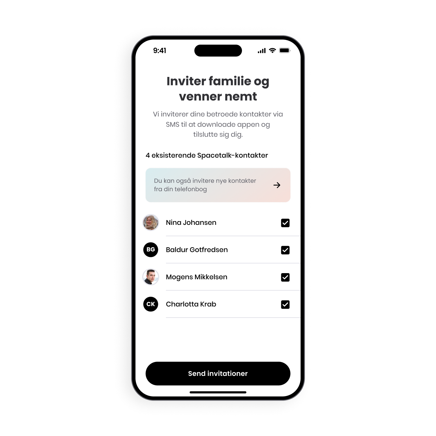 Vælg de betroede kontakter fra din telefons kontaktliste. Vi inviterer dine betroede kontakter via sms til at downloade appen og slutte sig til din familie.