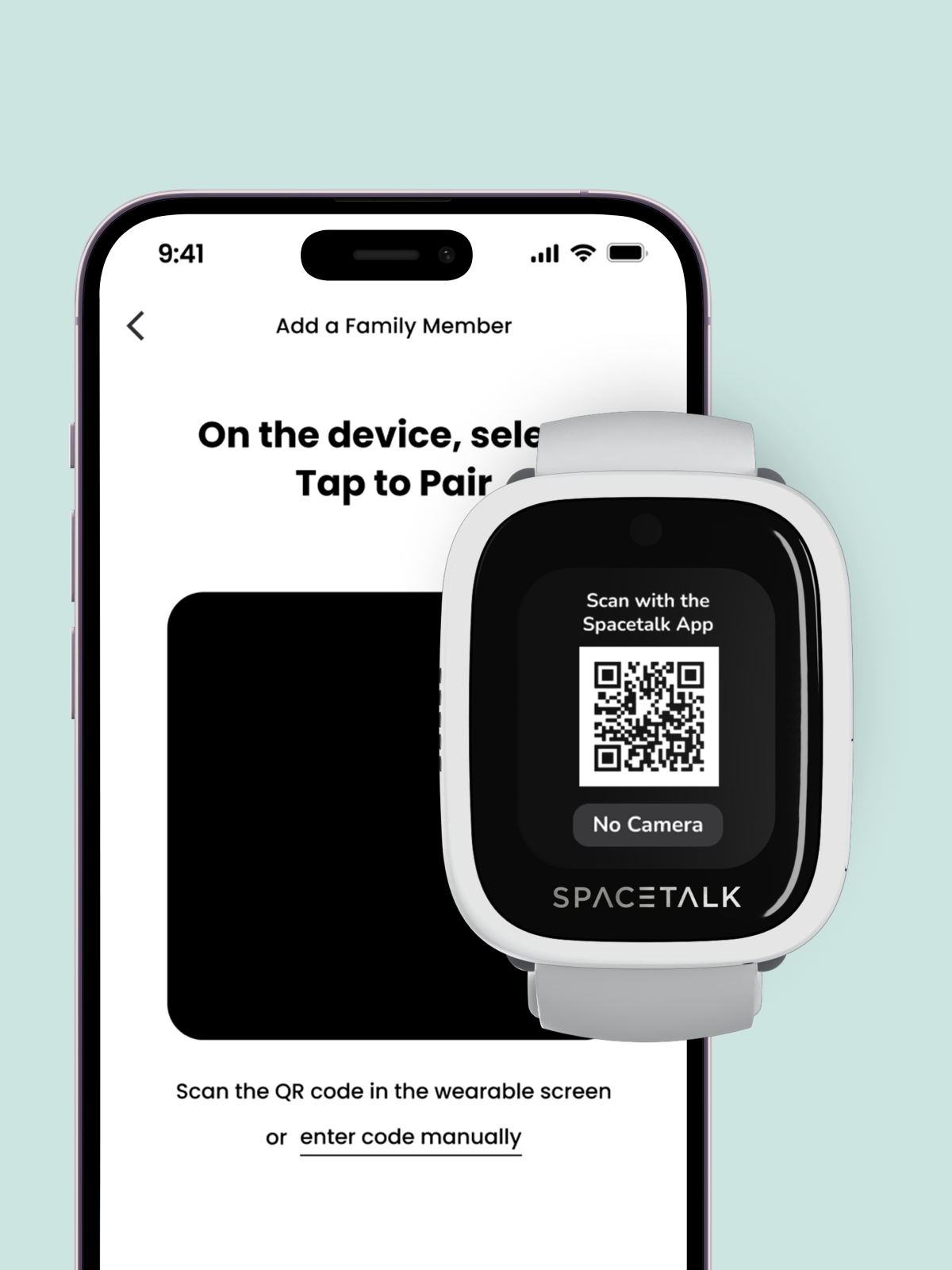 Spacetalk-appen åbner et kameravindue, som du kan bruge til at scanne den QR-kode, der er synlig på uret.