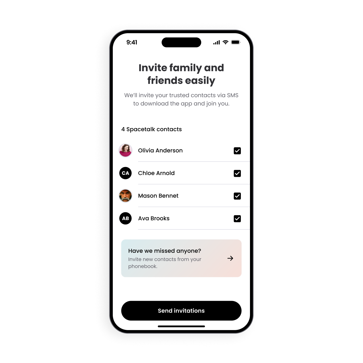 Select the trusted contacts from your phone's contact list. We’ll invite your trusted contacts via SMS to download the app and join your family.