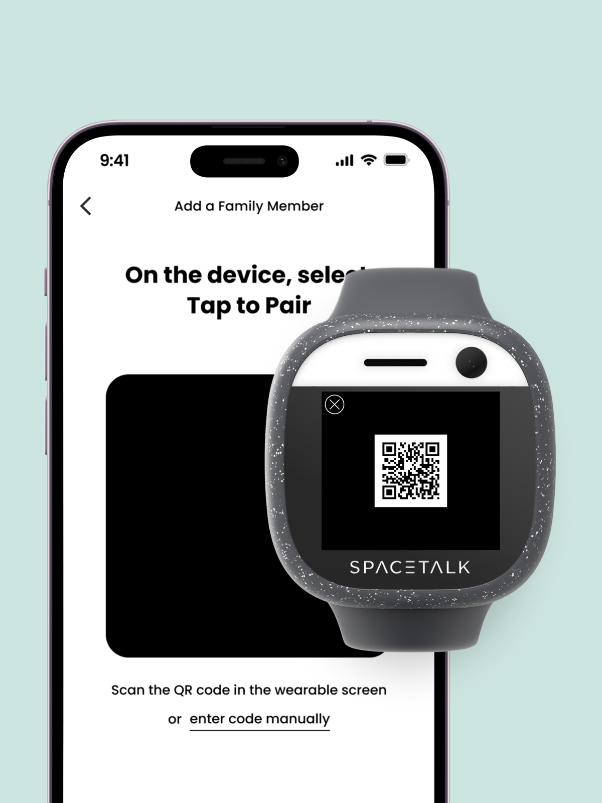 La aplicación Spacetalk abrirá una ventana de cámara que podrás utilizar para escanear el código QR visible en el reloj.