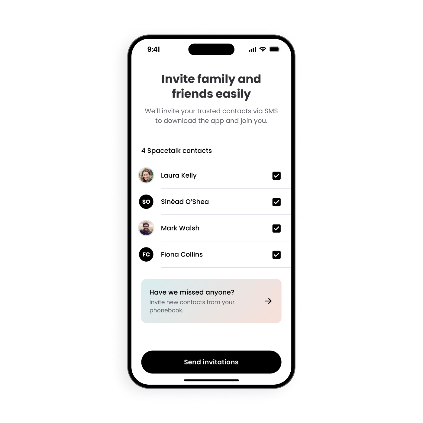 Selecciona los contactos de confianza de la lista de contactos de tu teléfono. Invitaremos a tus contactos de confianza por SMS para que se descarguen la app y se unan a tu familia.