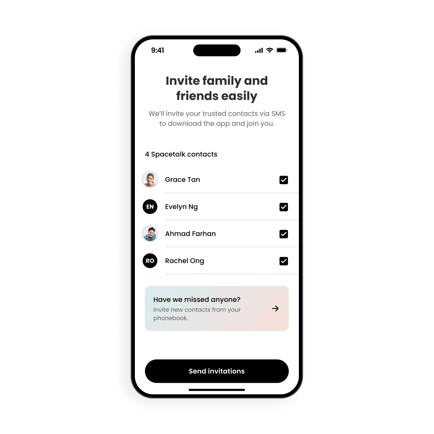 Selecciona los contactos de confianza de la lista de contactos de tu teléfono. Invitaremos a tus contactos de confianza por SMS para que se descarguen la app y se unan a tu familia.
