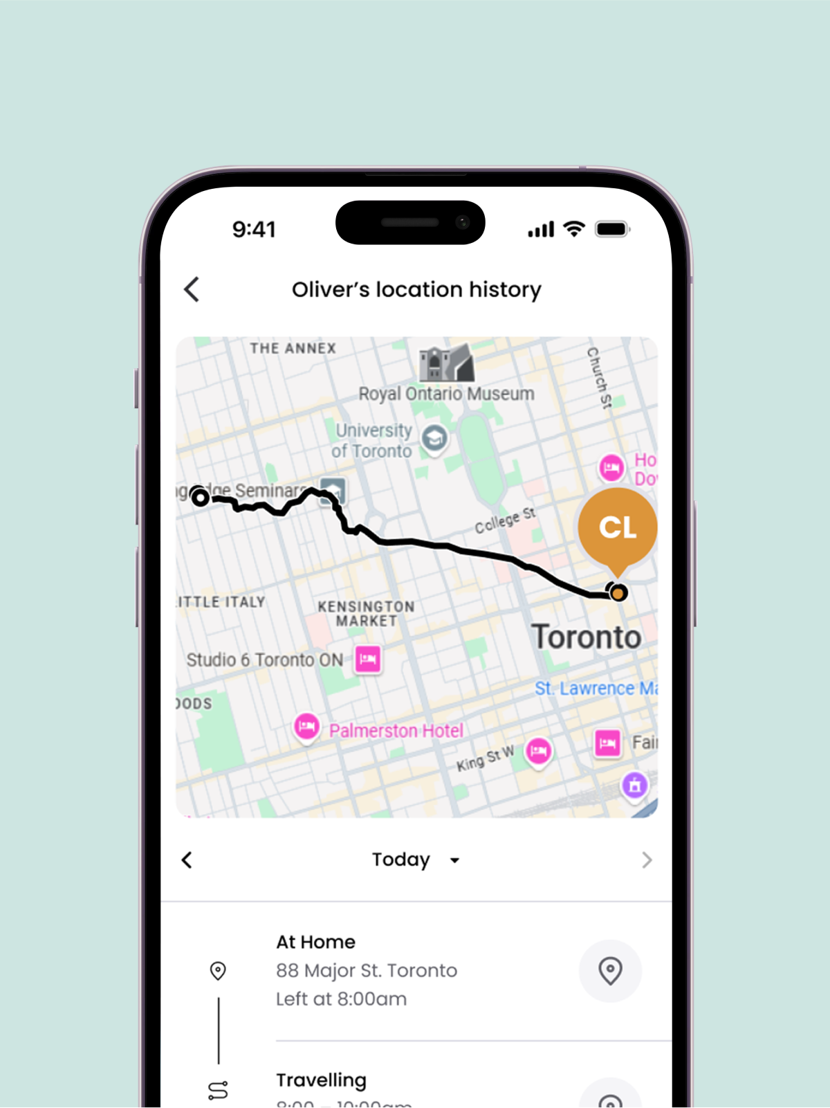 Affichez les 30 derniers jours de localisation, y compris le jour et l'heure de la visite. Vous pourrez également voir quand les contacts sélectionnés se déplacent et les zones de sécurité dans lesquelles ils sont entrés ou qu'ils ont quittées.
