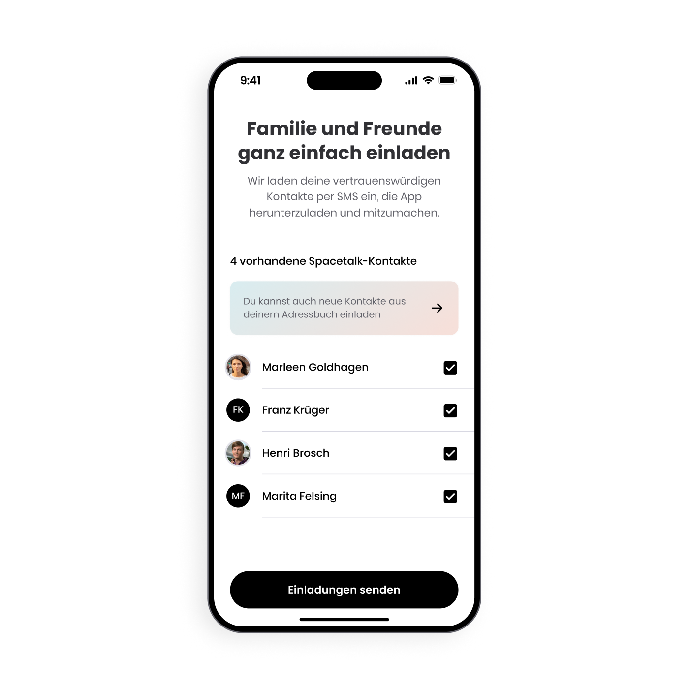 Sélectionnez les contacts de confiance dans la liste de contacts de votre téléphone. Nous les inviterons par SMS à télécharger l'application et à rejoindre votre famille.