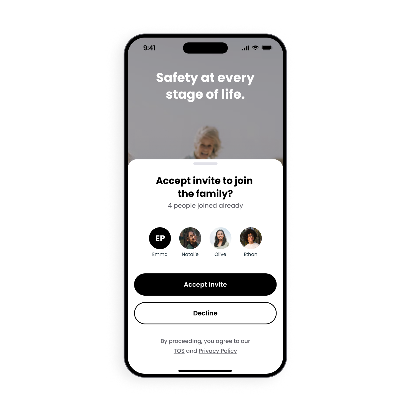 Välj betrodda kontakter från din telefons kontaktlista. Vi kommer att bjuda in dina betrodda kontakter via SMS och uppmuntra dem att ladda ner appen och gå med i din familj.
