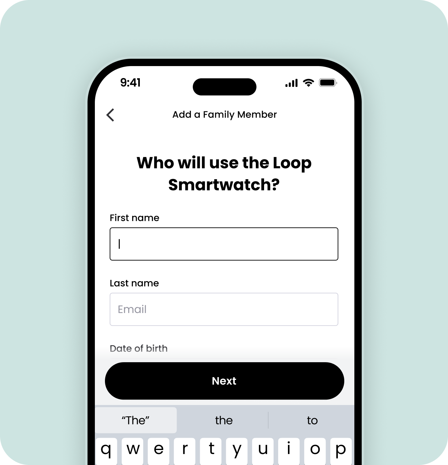Följ anvisningarna för att skapa din familj. Ange dina egna uppgifter som förälder i familjen. Barnets uppgifter kommer att begäras senare när du parkopplar klockan.